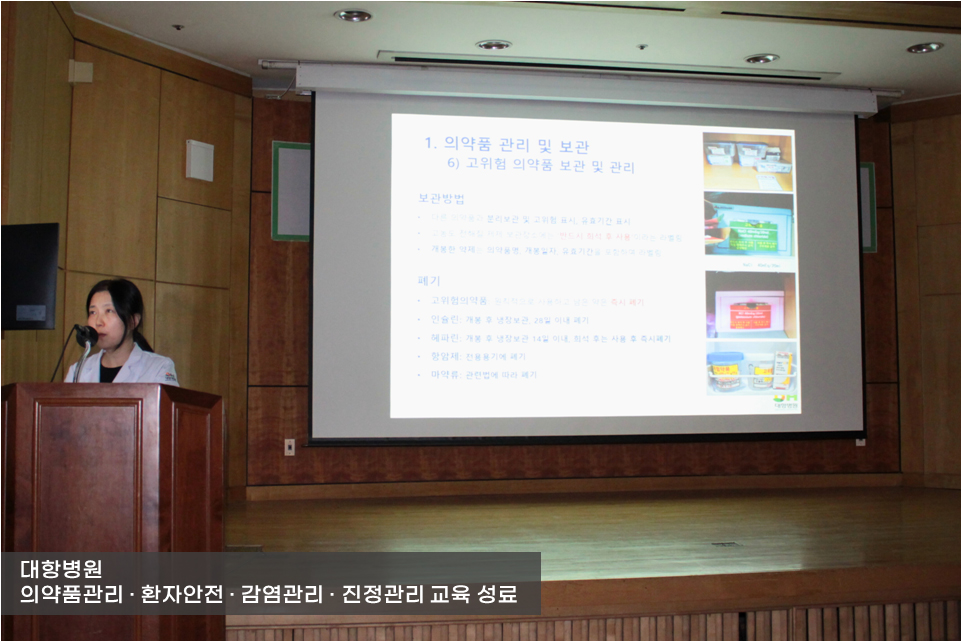 이번 교육은 의약품의 보관 및 마약류의 관리, 손위생 방법, 환자 안전 사례 등의 내용으로 이루어졌습니다.