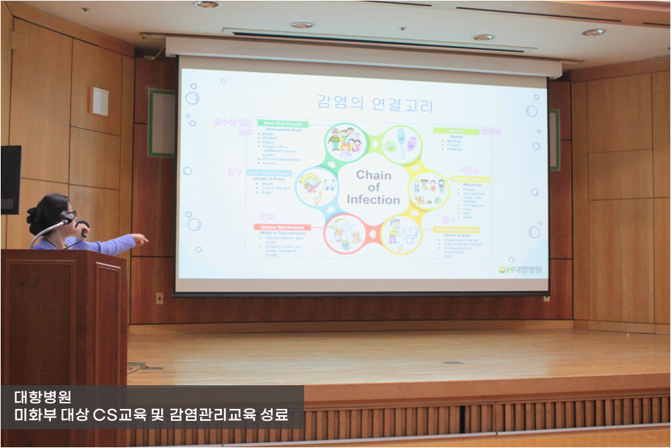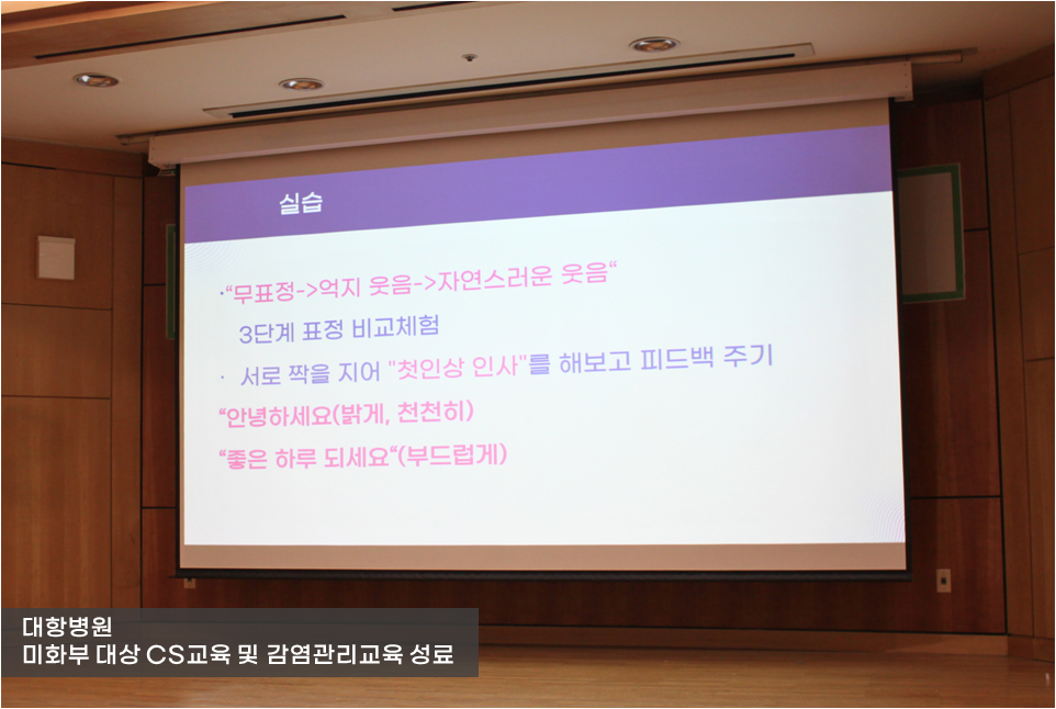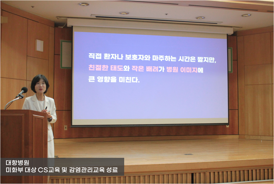 먼저, 박미애 간호부장이 진행한 CS교육은 '병원의 청결과 친절'을 주제로 진행되었습니다.