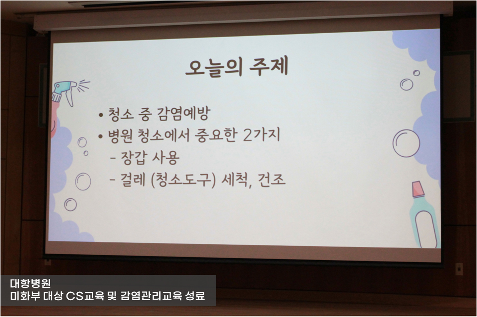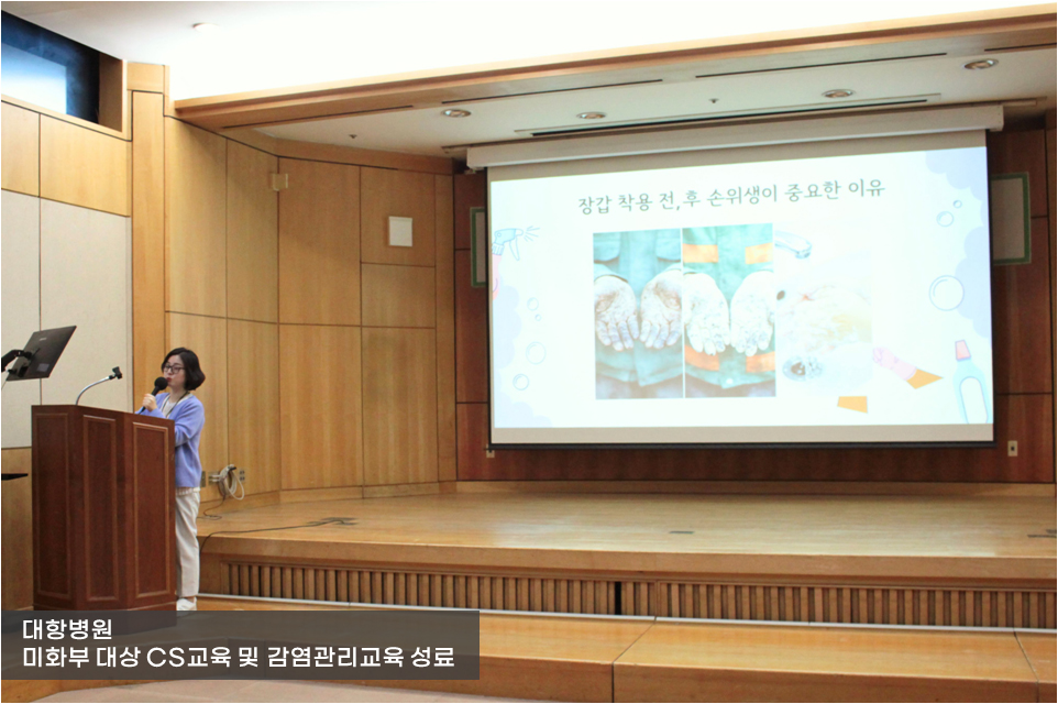 이어 감염관리실에서 진행한 감염관리 교육에서는 병원 환경 청소가 중요한 이유와 감염 예방 수칙에 대한 교육이 진행되었습니다.