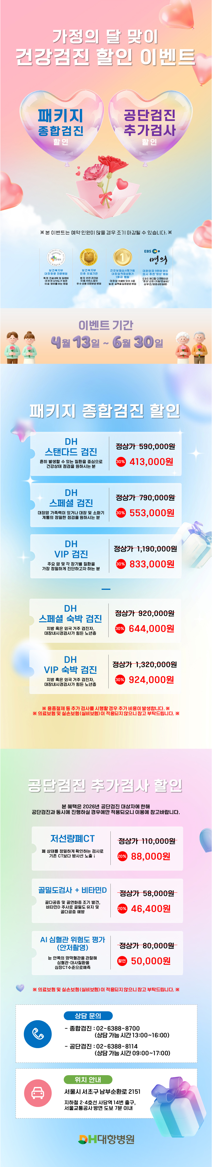 이벤트 기간 동안 종합검진 및 공단검진 추가검사를 특별 할인된 가격으로 제공해 드립니다.