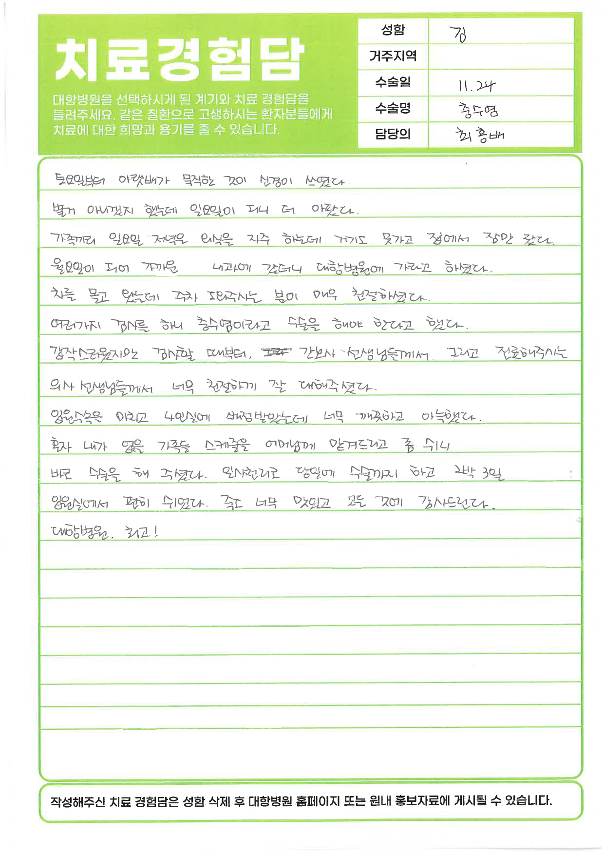• 대항병원에서 치료 및 수술을 받은 환자분들의 생생한 이야기를 전합니다.