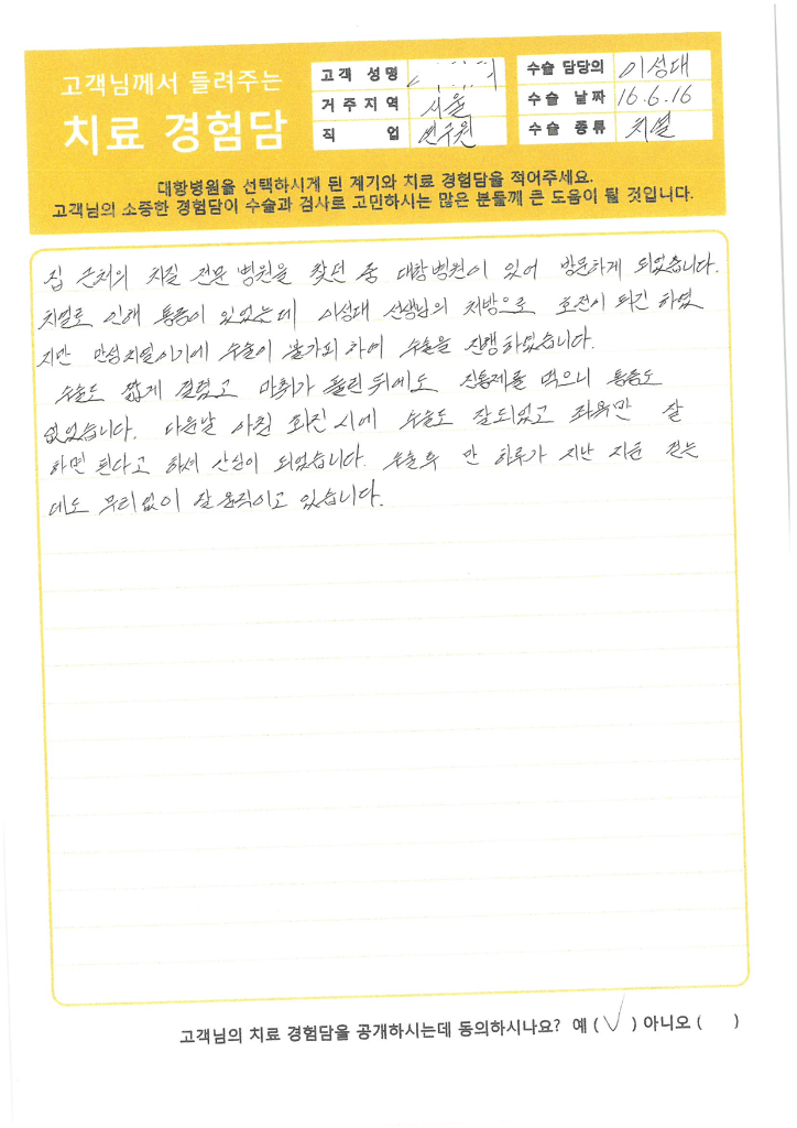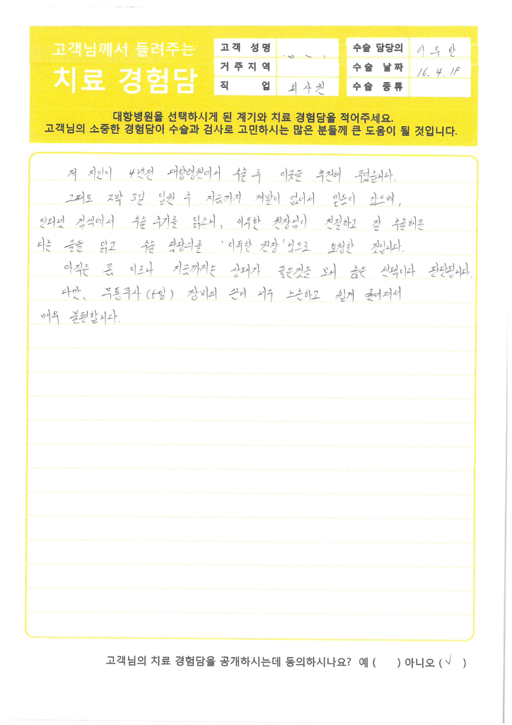 • 후기는 실제 환자분들의 자필 원본을 그대로 게재하고 있으며, 의료법 제 27조에 따라 상세 내용은 로그인 후에 확인이 가능합니다.