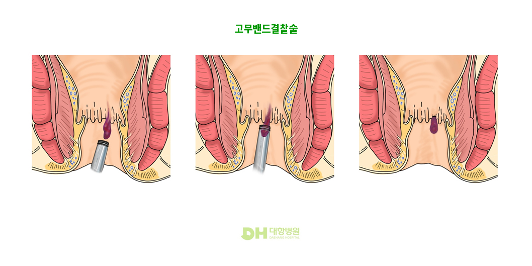 4) 고무밴드결찰술 고무밴드 결찰술이란 늘어진 치핵의 뿌리 쪽 덩어리를 피가 통하지 않도록 밴드로 단단히 묶어 조직이 떨어져 나가도록 하는 방법입니다. 시술을 할 때에는 요추 마취나 미추 마취의 필요 없이 국소 마취 하에 시행됩니다. 이 방법은 2~3도의 내치핵에서만 사용되는데, 외치핵의 경우 심한 통증이 유발되기 때문에 사용할 수 없고, 경미한 1도의 내치핵은 탈항 없이 출혈만 있는 단계이기 때문에 굳이 이 방법을 사용하지 않아도 됩니다.