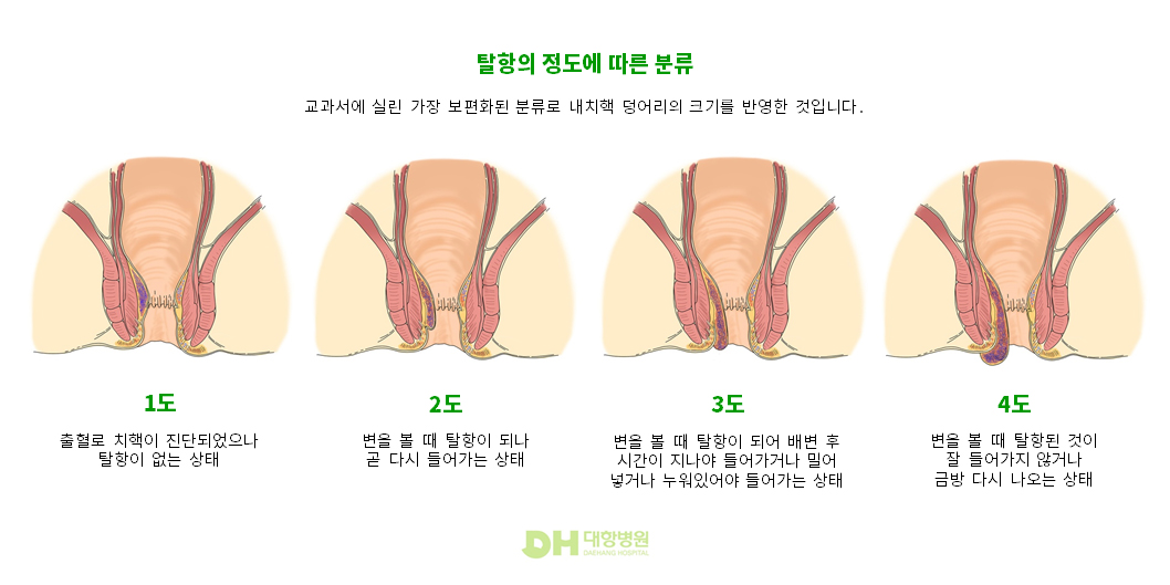 치핵 진행 정도는 어떻게 알 수 있나요? 치핵의 진행 정도는 탈항되는 상태에 따라서 1도부터 4도 치핵까지 분류합니다.