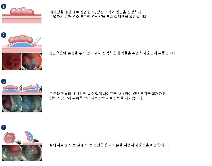ESD는 점막하층에 약물을 주입하여 용종과 함께 점막층과 점막하층을 띄워 내시경 수술용 나이프를 이용, 점막층과 근육층 사이를 박리하여 용종을 일괄 절제해 내는 방법입니다. 이러한 일괄절제의 장점은 용종의 상태를 가장 정확히 파악할 수가 있습니다. 또한 조직검사를 통해 림프절 전이의 위험인자가 없다면 조기 대장암일지라도 수술적 치료를 피할 수 있는 최소 침습 시술이라 할 수 있습니다.